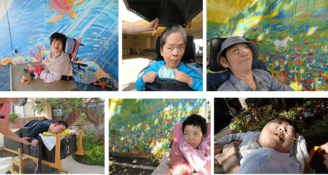 お天気の良い日にはお日様を浴びに「こもれびテラス」に行ったり、桜の木の下でお花やイラストレーターのちゃずさんが描いた鮮やかな色彩の壁画を鑑賞したりと、木々の青葉とともに初夏の様な陽気を楽しみました。