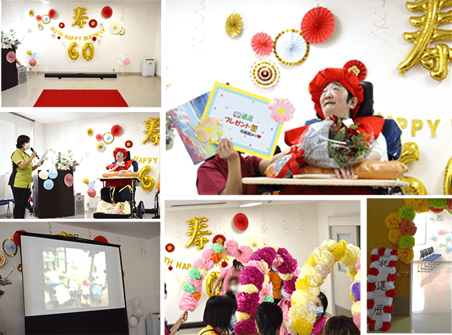 光陽園では、還暦祝賀会が行われました。祝賀会には、ご家族とたくさんの入所様、職員が参加し、還暦のお祝いを行いました。
