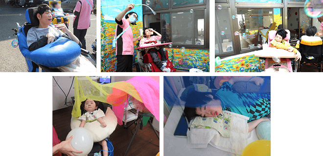 療育活動ではシャボン玉やスカーフによる感覚遊びをしました。