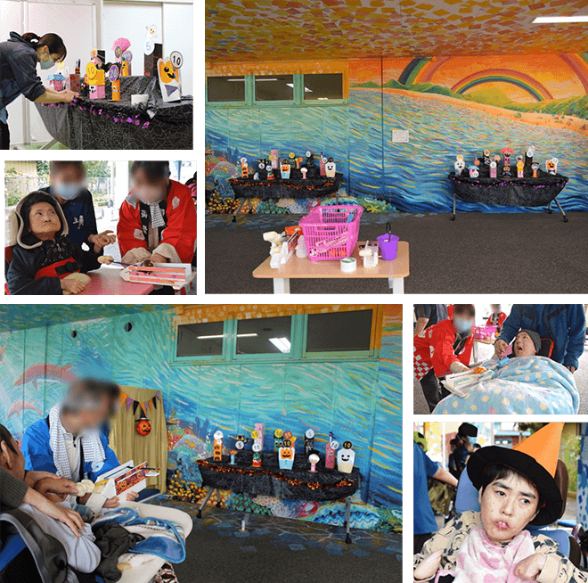 リハビリ課手作りのボール発射装置を使い、狙いを定めてボールを発射。高得点を出した入所者様もいて大盛り上がりでした。