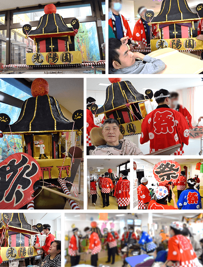 外観が綺麗になったお神輿で、入所者様一人一人の目の前を担いで回りました。