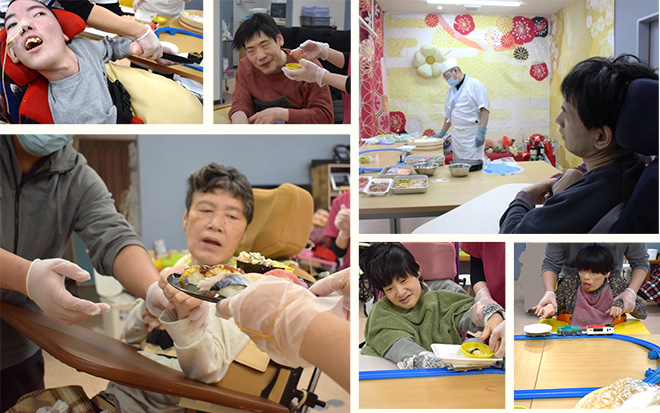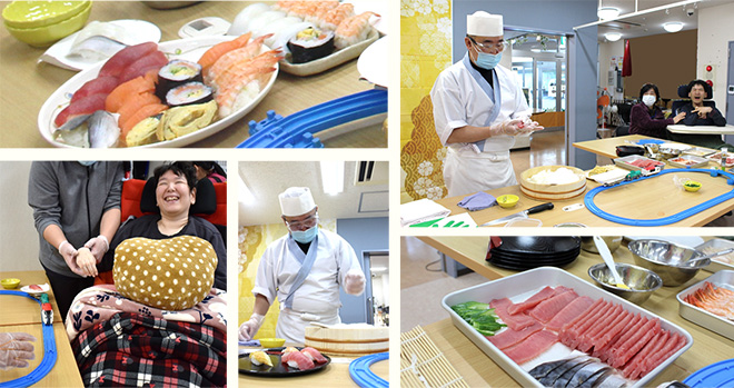 目の前で板前さん(光陽園の作業療法士さんです。)が握ってくれるお寿司は絶品! 食べたいネタをリクエストするとプラレールに乗せてお寿司を流してくれます。お美味しくて楽しいひとときとなりました~🍣✨