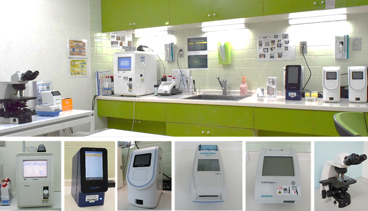 尿一般検査、血液一般検査、生化学検査、血液ガス検査、POCT(各種抗原定性検査:インフルエンザウィルス、咽頭アデノウィルス、便アデノウィルス、便ロタウィルス、便ノロウィルス、RSウィルス、ヒトメタニューモウィルス、SARSコロナウィルス抗原)、遺伝子検査(SARS-CoV-2 RNA マイコプラズマDNAの検出)など